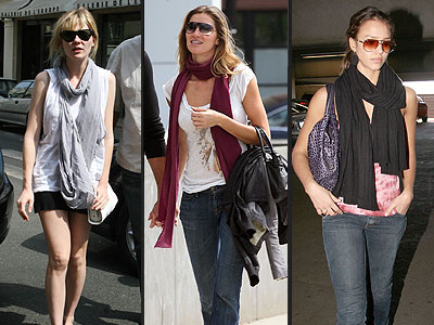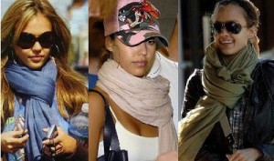 This is the hottest look going. Fold a large scarf into a triangle and place it over your décolleté like a bib. Tie it loosely in back and bring the ends around to the front. You can let the ends hang loose or tie them loosely under the bib or over the bib. Turn it a bit to the side and off you go.